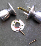 玄関には上下2ヶ所GOALのディンプルキーがついていました。お客様いわく、おそらく上の鍵しか閉まっていないだろうとのこと。しかしこのGOALのV18というディンプルキーは防犯性が高いので、ピッキングの開錠には非常に時間がかかるタイプです。一戸建ての家だったので他からの開錠方法を探ると裏に勝手口があり、ここにはWESTの握り玉タイプのノブが付いていました。鍵穴内部の構造上簡易的に開けられるタイプだったのでここから5分ほどですぐに開錠となりました。